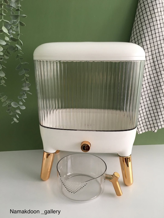 اگه میخوای برنجت دم دست باشه و یه ظرف خوشگل داشته باشه یدونه از اینا بخر از جمله محصولات محبوب این روز هاست ویژگی هاشو بخونی خودت دلیلشو میفهمی: کار وارداتی گنجایش ۱۰ کیلو برنج ابعاد: جنس بدمه اکرولیک جنس پایه و درب پلاستیک دارای پیمانه که به عنوان آبکش برنج هم مورد استفاده قرار می گیرد دارای محفظه نگهداری سیر و میخک در قسمت بالای درب